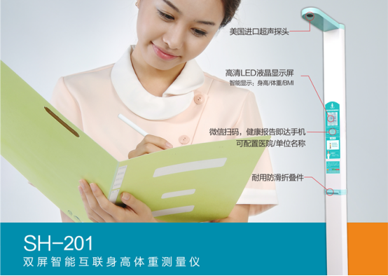 SH-201型雙屏智能身高體重測量儀是傳統(tǒng)數碼管身高體重測量儀的升級款,彌補了數碼管體重秤顯示效果單一,語音播報生硬的缺點。傳統(tǒng)的數碼管語音播報為機器播報,較為生硬;而SH-201型雙屏超聲波身高體重測量儀則采用智能語音播報,播報語音更人性化;雙屏采用高清的LED液晶顯示屏,可智能顯示身高、體重、BMI指數, 另一個屏幕可配置醫(yī)院或者使用單位名稱,同時測量結果可以微信掃碼,兼具廣告宣傳和微信吸粉功能,展示效果更好。而在定價上,幾乎等同于數碼管秤的價格,真正的做到了增值不加價,更多讓利給客戶。